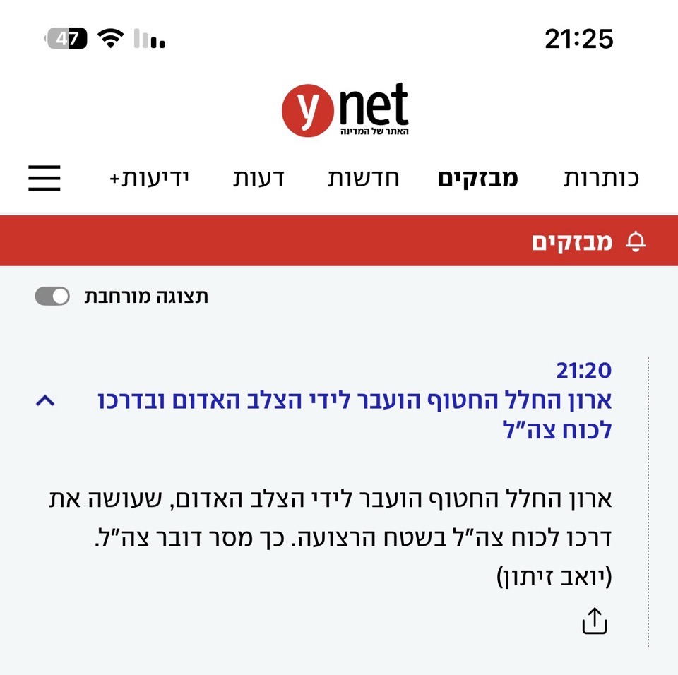 ערוצים עזתיים מדווחים שהזרוע הצבאית של חמאס מסרה זה עתה לידי הצלב האדום גופה של חטוף ישראלי.