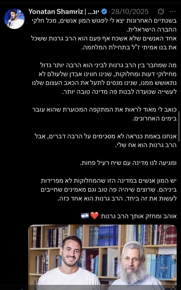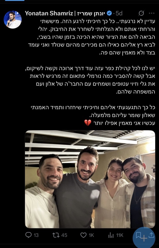 13. פעיל חברתי ומייסד תנועת ''קומו'', תנועת שטח לאומית שהקים עם משפחות שנפגעו בטבח שבעה באוקטובר.בתגובה להודעה מספר 0