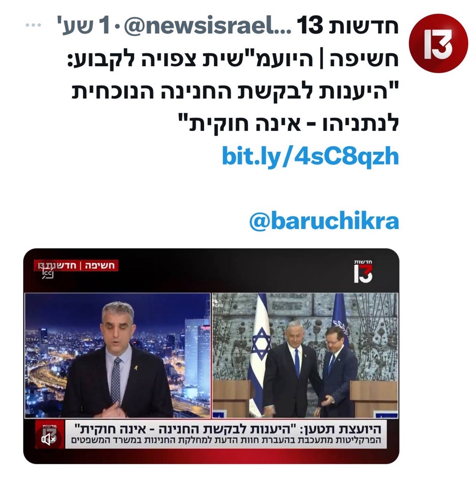 החנינה שנותן הנשיא אינה שפיטה ואין ערעור על כך ולכן הקביעה לגבי החוקיות היא קביעה שגוייה.| עדי | 07.01.2620:13 |