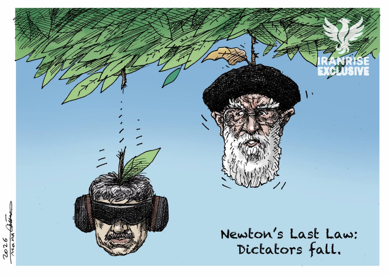 הקריקטורה מבטאת את החרדה בשלטון האיראני בעקבות קריסת בעלי בריתו. בחלקה העליון נראה ענף שממנו תלויים שני ראשים כשהשמאלי של ניקולס מדורו נופל. הימני של המנהיג העליון של איראן עַלִי חָ׳אמֶנֶאִי שמופנה הצידה, בדאגה, לעבר מדורו הנופל.