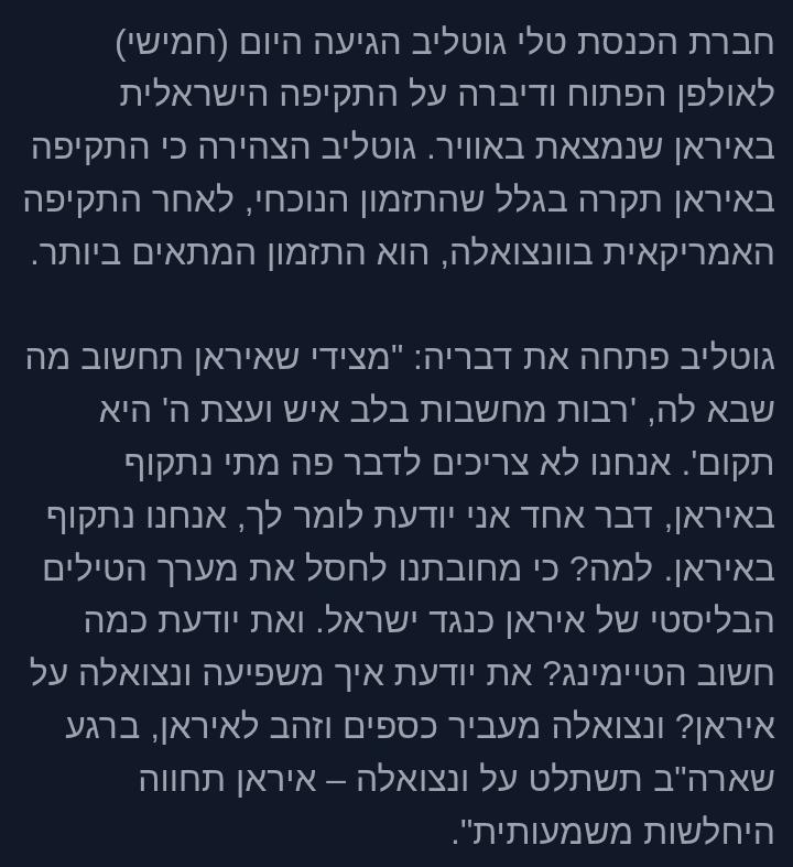 64. זה שנתקוף את איראן זה לא סוד אז אין שום בעיה עם האמירה של גוטליבבתגובה להודעה מספר 61